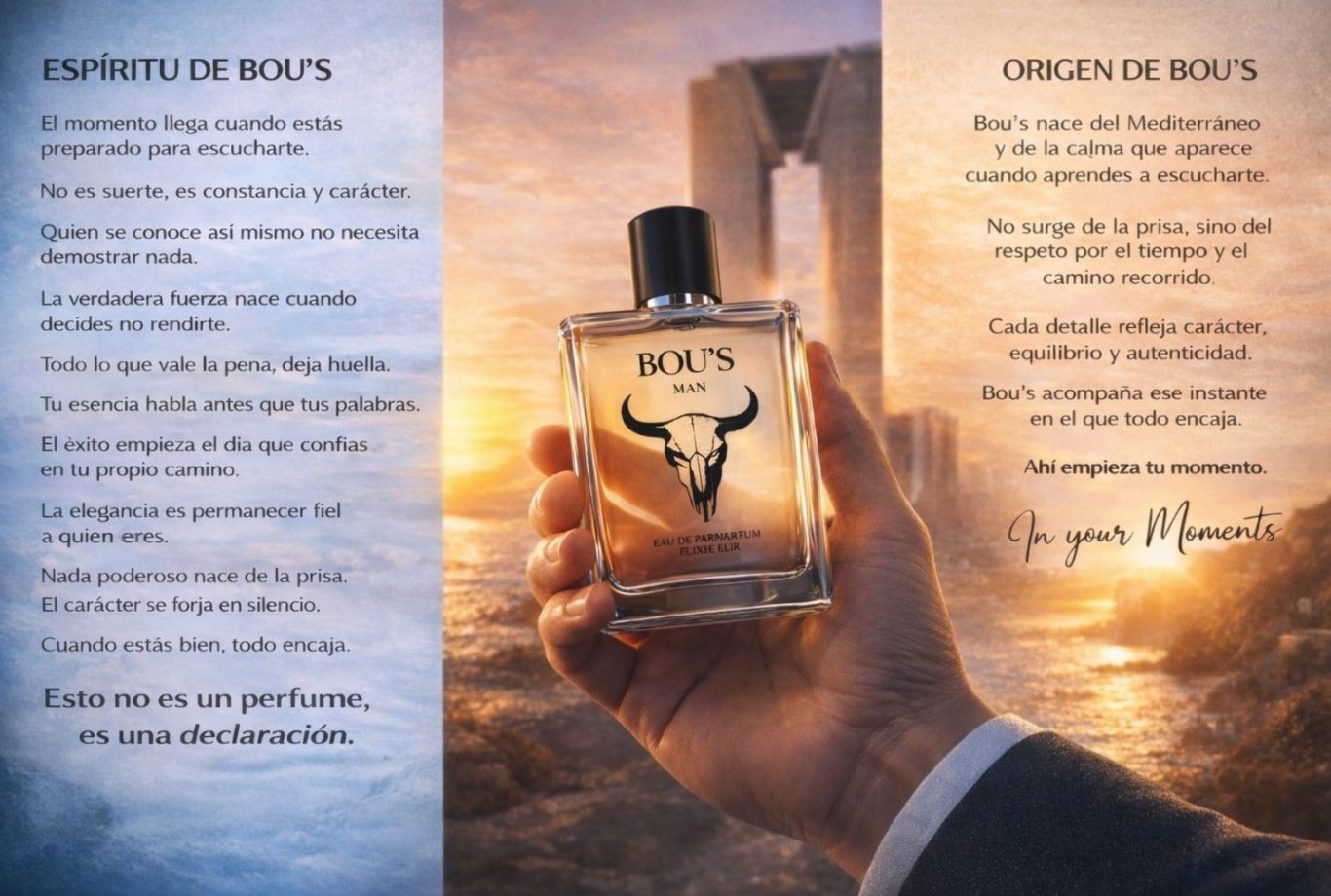 Bou’s Man Elixir nace del espíritu mediterráneo, de su luz, de su calma y de su manera natural de entender la vida. Una tierra donde la fuerza se expresa con serenidad y el carácter se construye con autenticidad.
